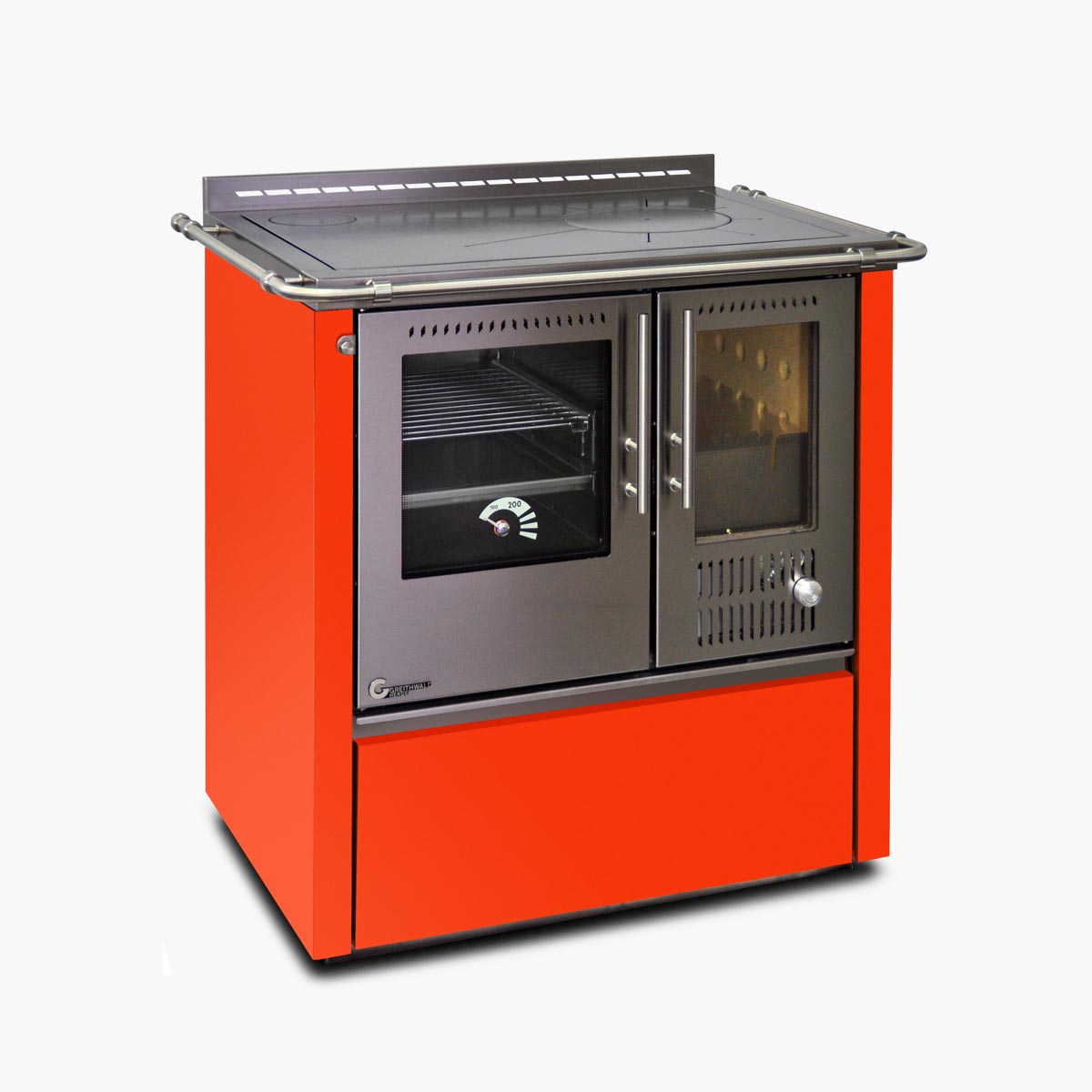 This cooker can be customised in terms of colour, size, decorations and accessories. The standard equipment of these cookers is exceptional: precious materials, fire door and oven in stainless steel, double glass on fire, handles in stainless steel, levelling feet, integrated ventilation available in the natural version and handrail on three sides.